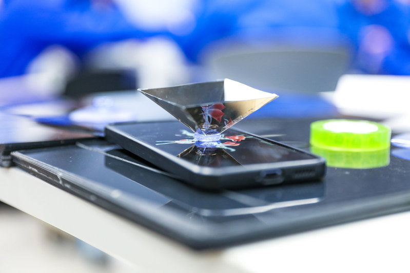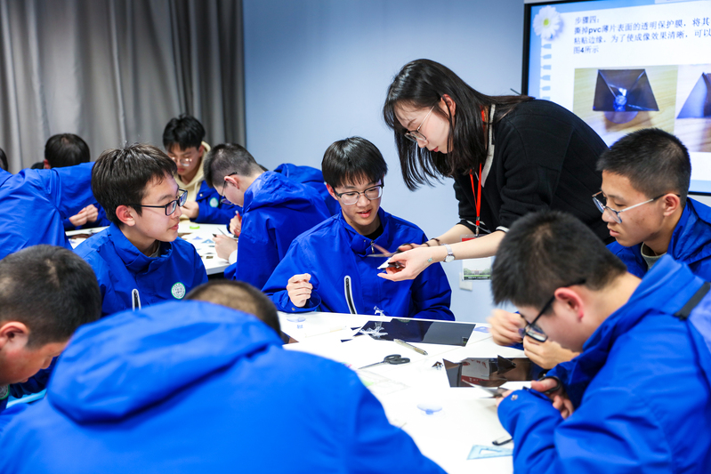 在智慧教室小实验环节,志愿者为同学们现场展示了最简单的光学器件制作,而后在志愿者和现场老师的指导下,在场学生纷纷动手操作,利用PVC薄片搭建全息金字塔,通过光的衍射作用汇聚成虚拟立体影像,将物体的三维图像进行再现,零距离体验全息投影技术。小实验环节后,志愿者们还分别从大学里的学习、生活、社团等不同方面与在场学生进行交流,分享了各自的求学经历,希望同学们能提前做好人生规划,以力所能及之力回馈社会、回馈国家,践行青春理想。