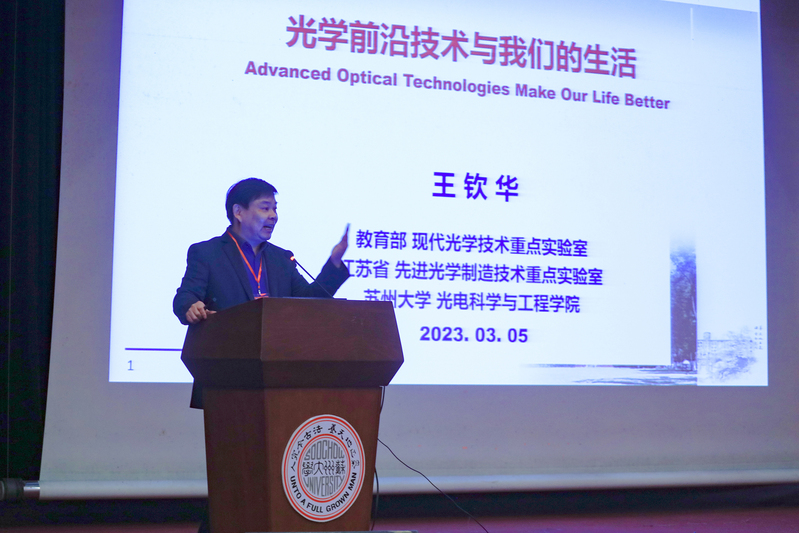 而后,王钦华教授以《光学前沿技术与我们的生活》为主题展开了一场深入浅出的科普讲座,重点介绍了苏州大学光学工程重点实验室主要研究方向和成果,并围绕新型显示技术、高/超分辨率平面成像技术、超材料与光场(电磁波)调控技术以及柔性光电子与可穿戴器件等热门技术深入浅出地展示了纳米光子学、亚波长光学的最新发展,揭示了光学前沿和技术研究与我们日常生活的密切联系。王钦华教授表示,重点实验室的开放活动是光电学院多年来一直坚持的活动,希望参与活动的学生能近距离走进光电世界,感受科技魅力。