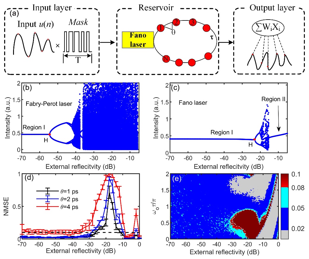 神经形态计算的目标是实现能够以类似于人类大脑的方式处理信息的智能系统。其中储备池计算作为一种轻量级、高速的神经形态计算范式,在解决时间依赖性任务方面取得了巨大的成功。由于电子不可克服的缺陷和光子的超高速、超低功耗等优势,在光学领域构建储备池模型处理时间相关任务受到广泛关注。为了实现高速、低功耗、可集成的类脑信息处理系统,李念强教授课题组设计了一种基于紧凑型法诺(Fano)激光器的时延型光子储备池计算模型,并在时间序列预测和非信道均衡基准任务中展示出卓越的性能。得益于法诺镜的存在,法诺激光器对外部反馈具有不敏感特性。因此,本文提出的储备池无需通过任何外部注入稳定激光器的输出,即可获得理想的储备池计算实现条件,同时降低了硬件实施的难度。基于法诺激光器具有超快的动力学特性,提出的储备池计算模型具有更短的反馈时延,其信息处理速率可以达到10 Gbps。此外,此研究结果显示,法诺激光器基储备池计算模型对于反馈相位具有较好的鲁棒性。更重要的是,法诺激光器具有极小的体积(>100 μm2),其具备光子储备池小型化的潜力。此研究结果为实现基于储备池计算的高速、小型化神经形态光子系统提供了理论指导。