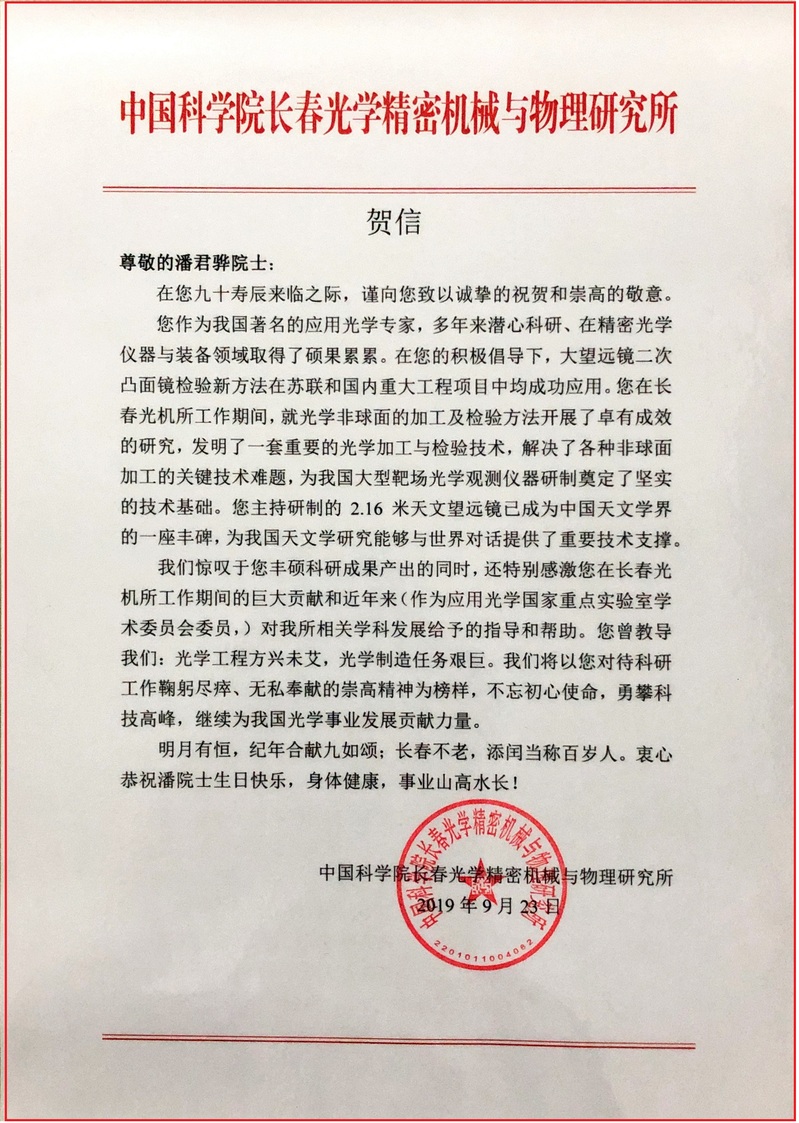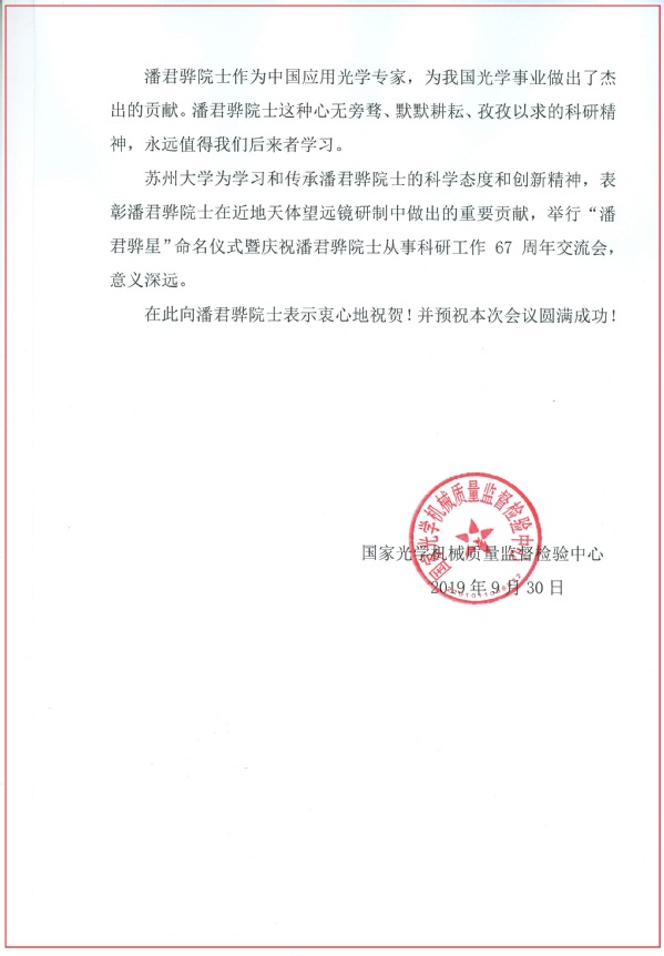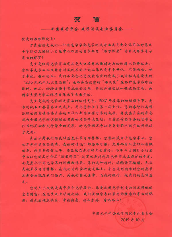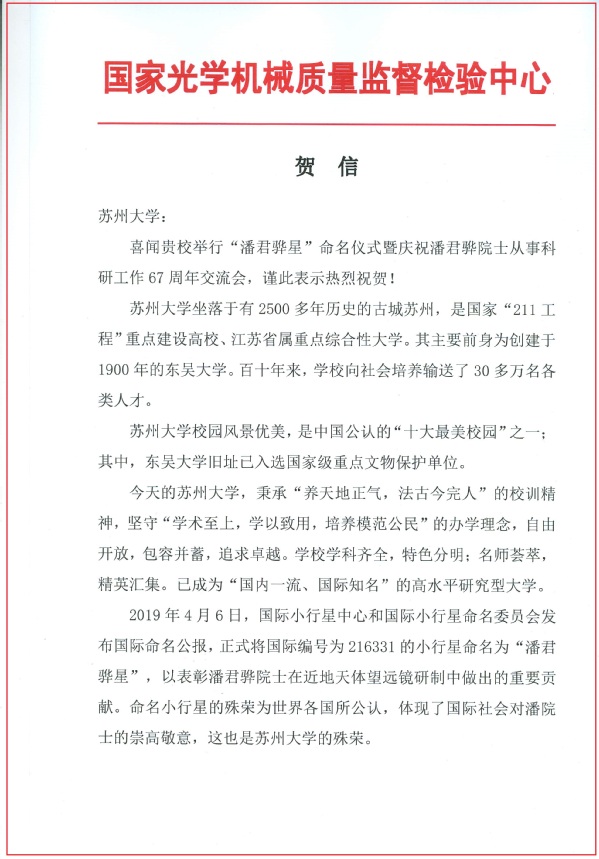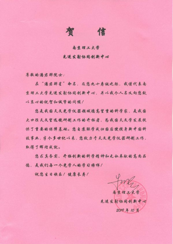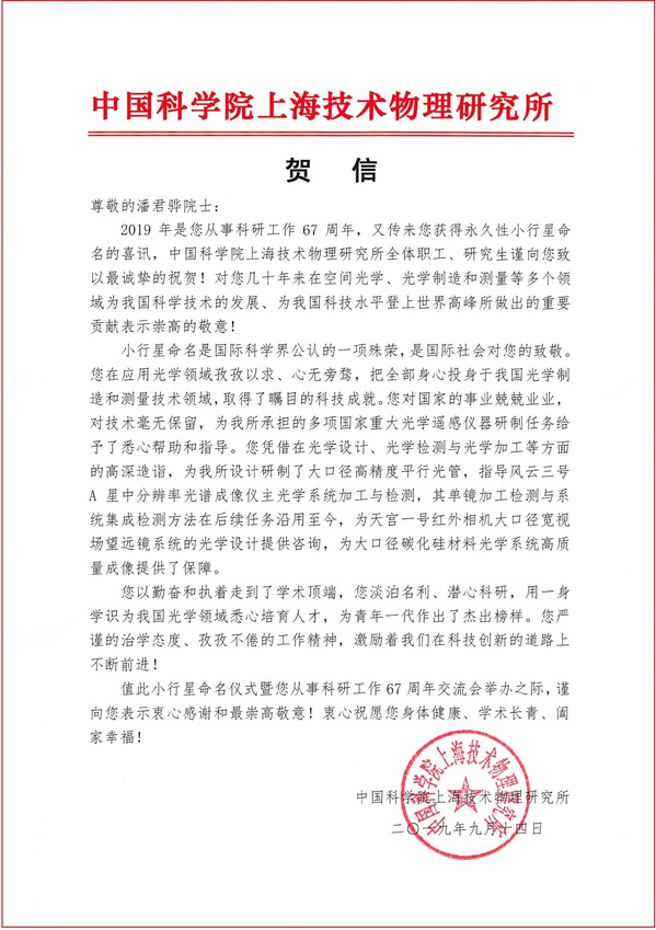 关于潘君骅院士喜获“潘君骅星”命名的贺信