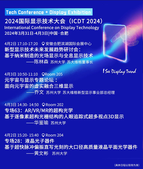 2、ICDT 2024聚集业内顶尖的专家学者,陈林森研究员、乔文教授、黄文彬教授、华鉴瑜博士进行学术分享汇报,共同探讨新型显示技术的前沿动态和未来发展趋势
