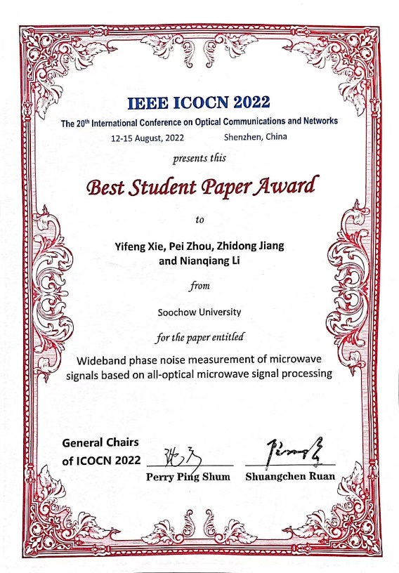 2022年8月12-15日,在第20届国际光通信与光网络会议(The 20th International Conference on Optical Communication & Networks, ICOCN2022)上,我院2018级本科生谢溢锋同学(指导老师:李念强教授和周沛副教授)以第一作者在大会上作了题为“Wideband phase noise measurement of microwave signals based on all-optical microwave signal processing”的口头报告,并荣获“最佳学生论文奖”(Best Student Paper Award)。