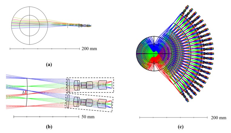 1 级联结构成像系统的光学布局:(a)单通道光学布局;(b) 次级中继成像光学系统布局(c)全通道光学布局。
